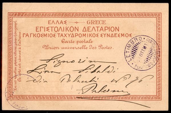 Letimbro Piroscafo Postale Italiano (in viola) - cartolina per Palermo del 18.10.01 - affrancatura asportata