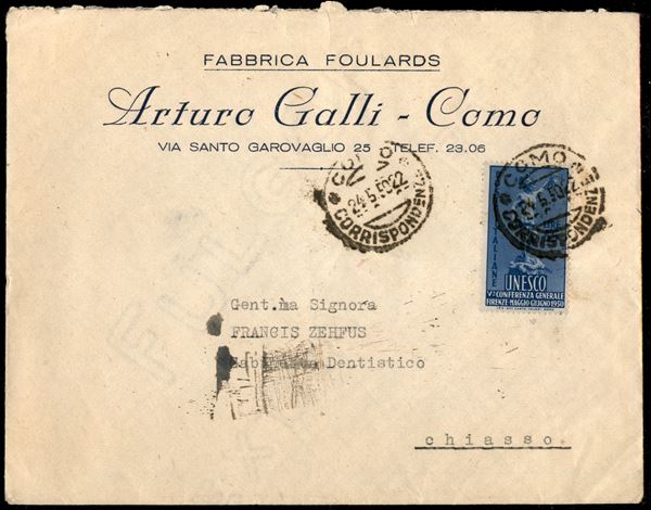Lettera da Como per la Svizzera del 24.5.50 con 55 lire Unesco (619) senza annullo d'arrivo