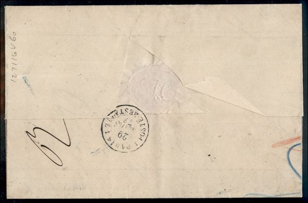 Lettera da Firenze a Parigi del 27 mar 78 con 10 cent + 60 cent (17 + 21) - bollo in cartella Francobollo Insufficiente e segno di tassa