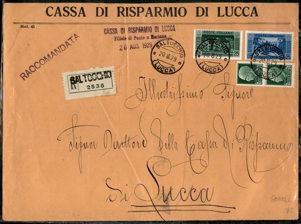 Manoscritti due porti raccomandati con Imperiale coppia 25 cent + Montecassino 25 cent + 1,25 lire (248 + 263 + 266) da Saltucchio 20.8.29 per Lucca con valori gemelli