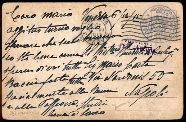 Mariannina Piroscafo Requisito dallo Stato - cartolina in franchigia da Venezia a Napoli del 6.12.15