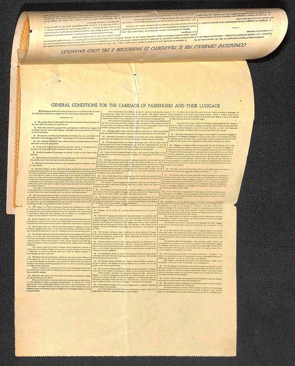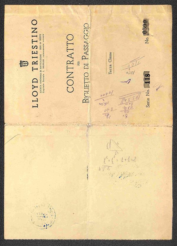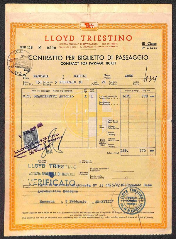 Navigazione - Lloyd Triestino - 1940 - Contratto per Biglietto di Passaggio da Massaua a Napoli (III Classe) a Tariffa Militare (Comando Base Aeronautica)