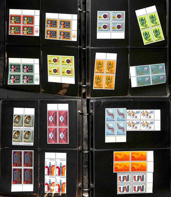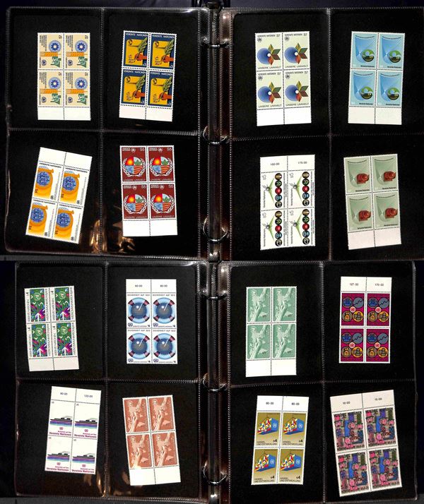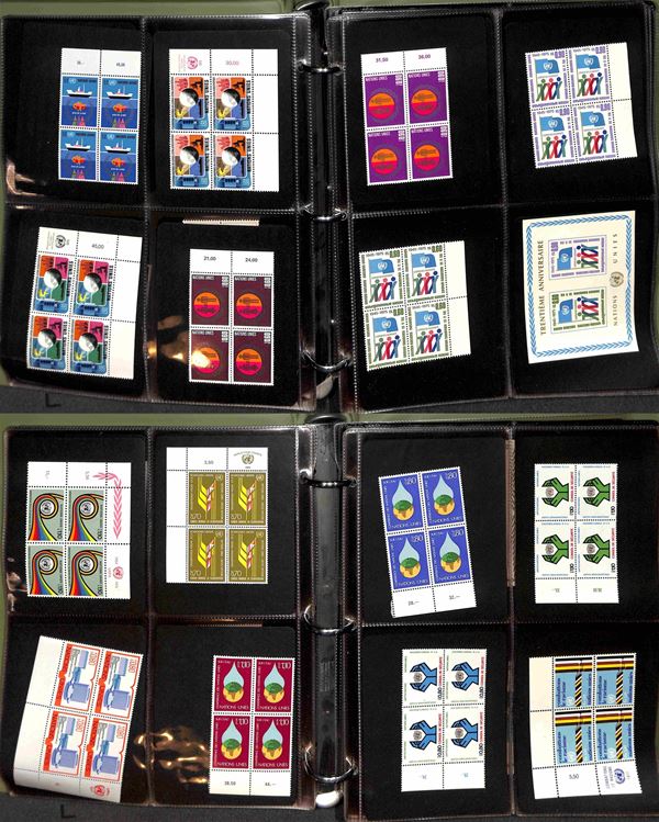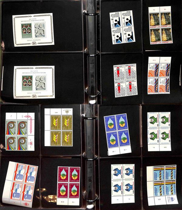 NAZIONI UNITE - 1957/1983 - Collezione di valori principalmente nuovi del periodo degli uffici di Ginevra, New York e Vienna in 3 album ad anelli + un album di estero misto - da esaminare