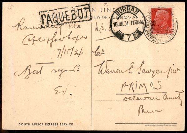Piroscafo Postale Italiano Duilio - 75 cent (252) su cartolina da Durban (Sud Africa) del 16.7.34