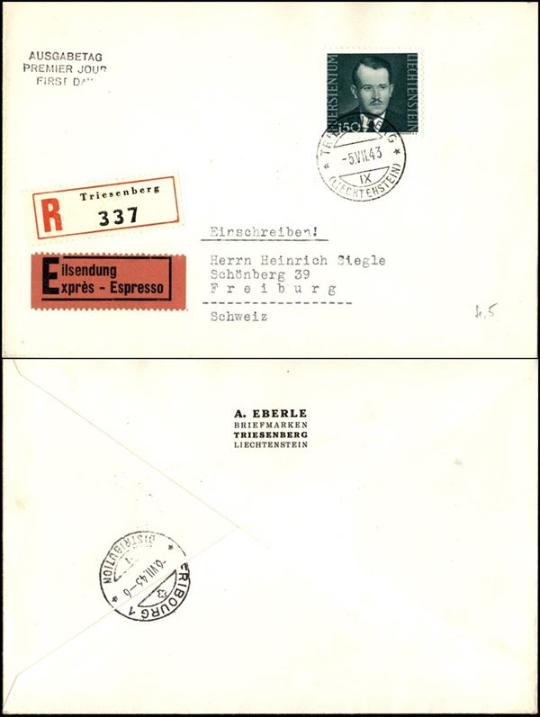 Primo Giorno - raccomandata espresso affrancata con 150 rp. (217) da Triesenberg a Freiburg del 5.7.43