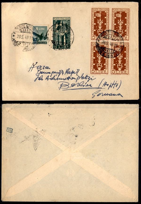 Quartina del 5 lire + un 15 lire Biennale di Venezia (594/595) + 8 lire Democratica (557) su busta da Firenze a Berlino del 28.5.49