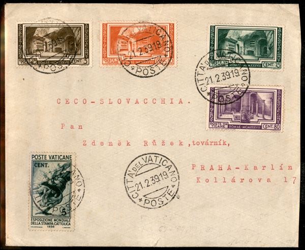 Quattro valori Congresso Archeologico + 5 cent Stampa Cattolica (47 + 55/7 + 59) su lettera del 21 febb 1939 per Praga