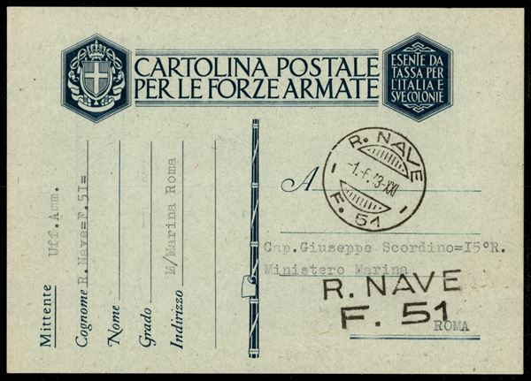 R. Nave F. 51 - cartolina in franchigia per Roma del 1.6.43