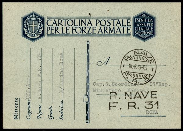 R. Nave F.R. 31 - cartolina in franchigia per Roma del 18.6.43