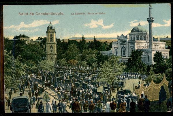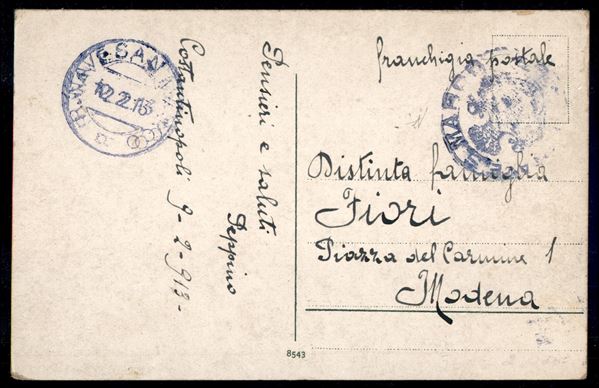 R. Nave S. Marco (in viola) - cartolina in franchigia da Costantinopoli a Modena del 12.2.13