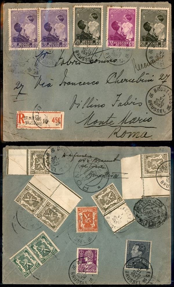 Raccomandata affrancata per 5,5 franchi (329 + 415 + 416 x 5 + 421 x 2 + 428 + 434 + 444 x 2 + 446) da Bruxelles a Roma del 7.6.1937