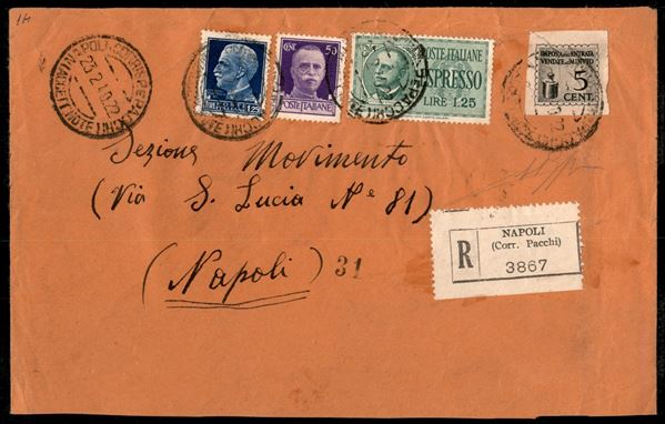 Raccomandata con Imperiale 50 cent + 1,25 lire + Espresso 1,25 lire + marca Imposta sull'Entrata Vendita al Minuto 5 cent da Napoli 23.2.40 per cittą