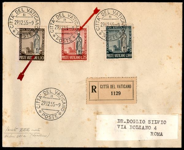 San Bartolomeo serie completa con il 10 ed il 25 lire che presentano la figura del Santo fortemente spostata (200a/201a/202) su raccomandata FDC