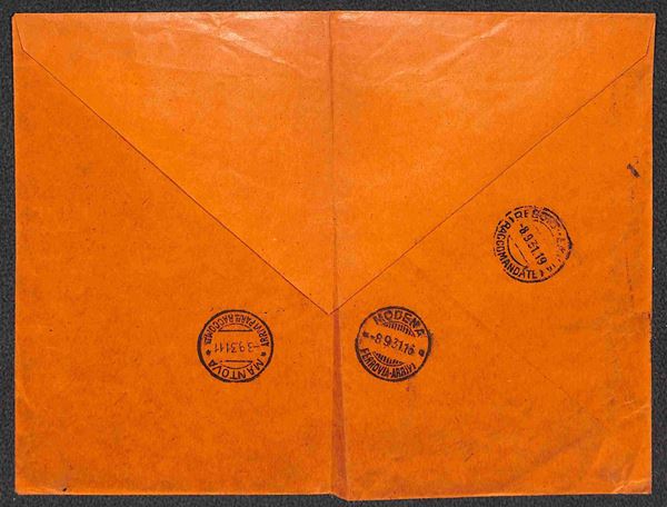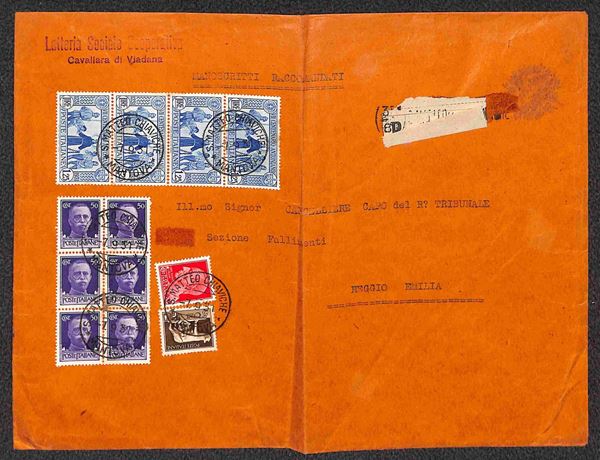 Striscia verticale di quattro 1,25 lire + blocco di sei 50 cent + 20 cent + 5 cent (243 + 247 + 259) su bustone raccomandato tariffa manoscritti da S. Matteo Chiaviche per Reggio Emilia del 7.9.37