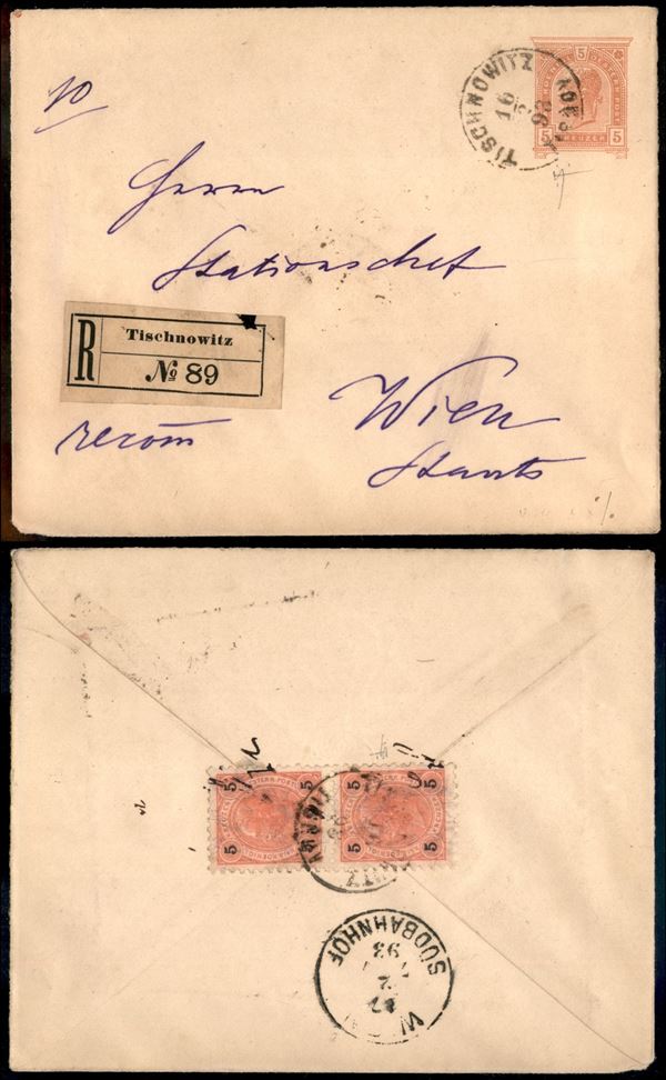 Tischnovitz - busta postale da 5 kreuzer raccomandata con coppia del 5 kreuzer (53) al retro per Vienna del 16.2.93 - alfani