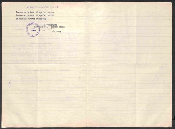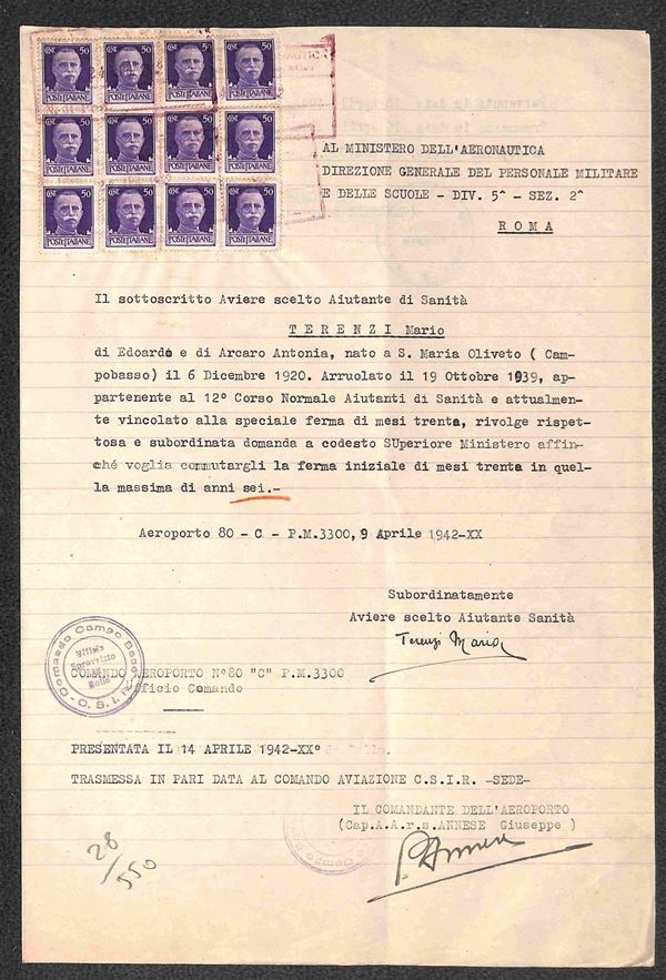Uso fiscale - Comando Campo Base/C.S.I.R. - dodici pezzi del 50 cent (251 - Regno) annullati con timbro a cartella Ministero dell’Aeronautica 24.4.42 (rosso) su documento di richiesta di prolungamento del servizio di leva