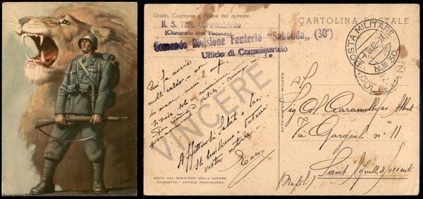 Vincere (Boccasile) - cartolina in franchigia dalla P.M. 30 (7.10.42)