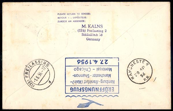 Volo Lufthansa LH432 del 27.4.56 - tappa Francoforte/Manchester - aerogramma viaggiato (178 + 180 + 207)