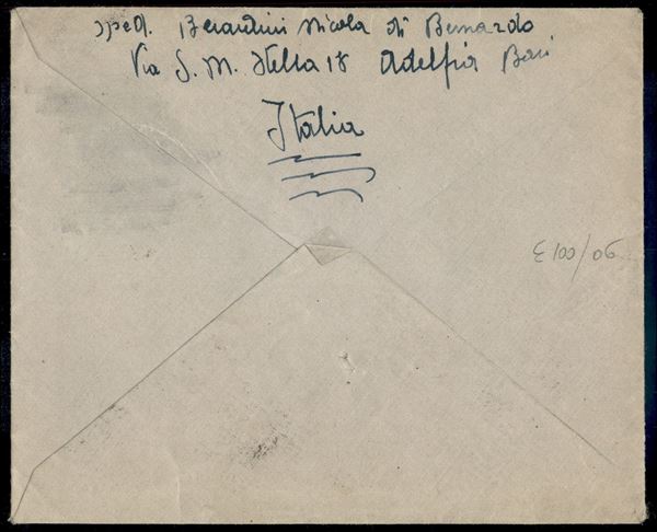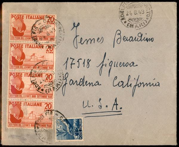 XIII Fiera del Levante 20 lire in striscia verticale di quattro + Democratica 15 lire (610 + 560) su lettera per la California da Adelfia Canneto 24.8.49