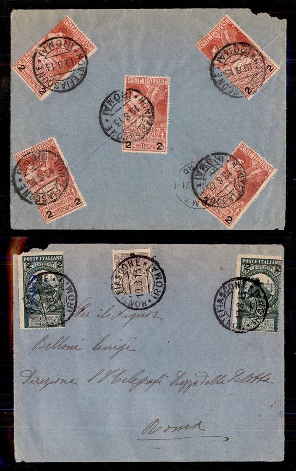 1 cent Floreale (68) + due 2 cent su 5 (99) + cinque 2 cent su 10 (100) al retro - busta da Montefiascone a Roma del 19.8.13 - da esaminare