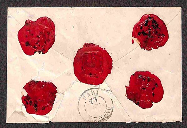 10 cent (17) annullato con croce a penna + due 20 cent (26) - bustina raccomandata da Bergamo a Bari del 22.7.74