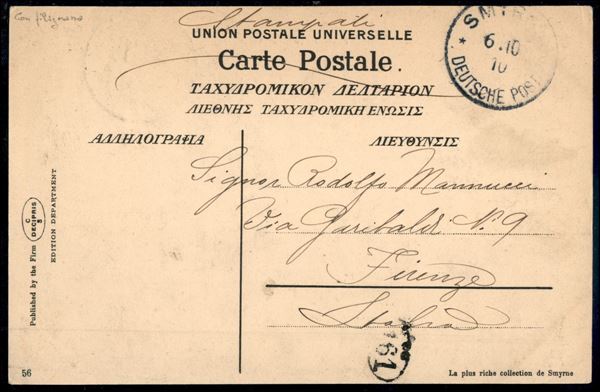 10 para su 5 pfennig (36) - cartolina da Smirne a Firenze del 6.10.1910