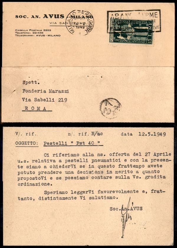 15 lire Biennale (595) isolato su piego da Milano a Roma del 12.5.49