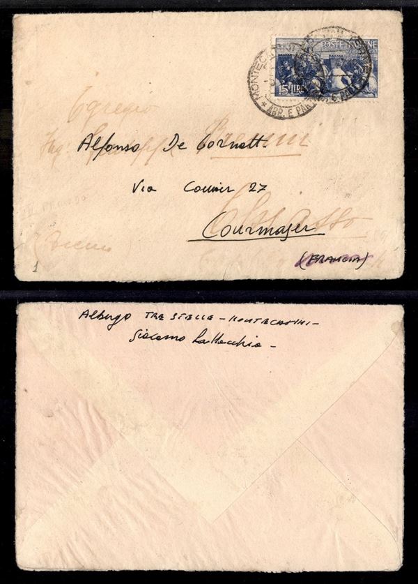 15 lire Repubbliche Marinare (572) isolato su busta da Montecatini a Chiasso del 5.3.47 inoltrata a Courmayeur