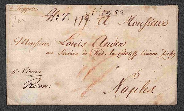 1805 (12 ottobre) - Bustina completa del testo raccomandata da Troppan a Napoli via Vienna - tassata