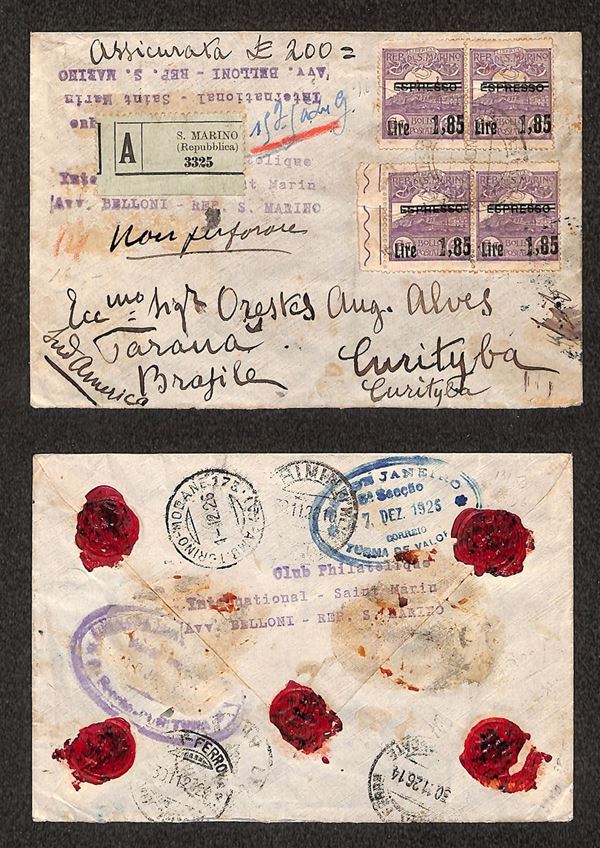 1,85 lire su 60 cent (129) - due coppie su assicurata da S.Marino per il Brasile del 23.11.26