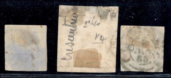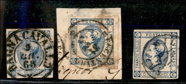 1863 - 15 cent Litografico (12) - insieme di 2 usati + 1 frammento con annulli Bagnacavallo Crescentino e Milano