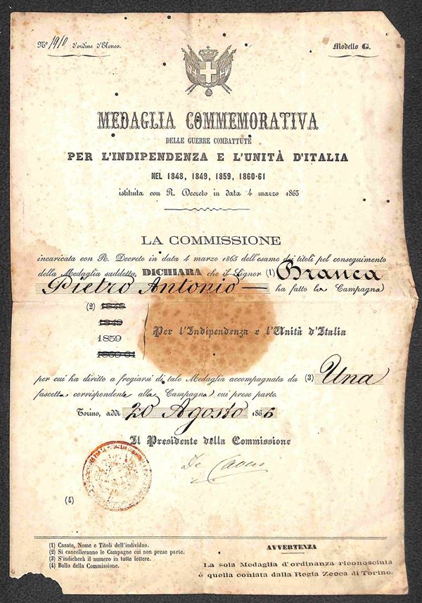 1866 - Medaglia Commemorativa delle Guerre d'Indipendenza 1848/1861 - Decreto di conferimento per la Campagna del 1859 - Torino 20.8.66