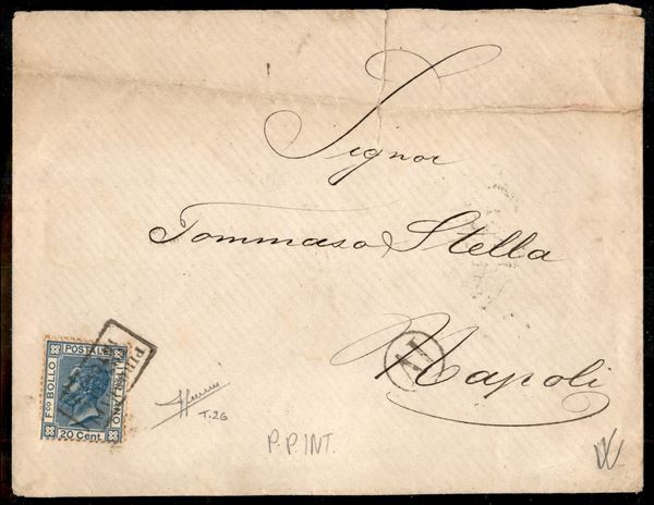 1874 Busta da Palermo per Napoli con 20 cent (26) annullato in arrivo con bollo in cartella Piroscafi Postali Interno in data 24 nov. - Sorani