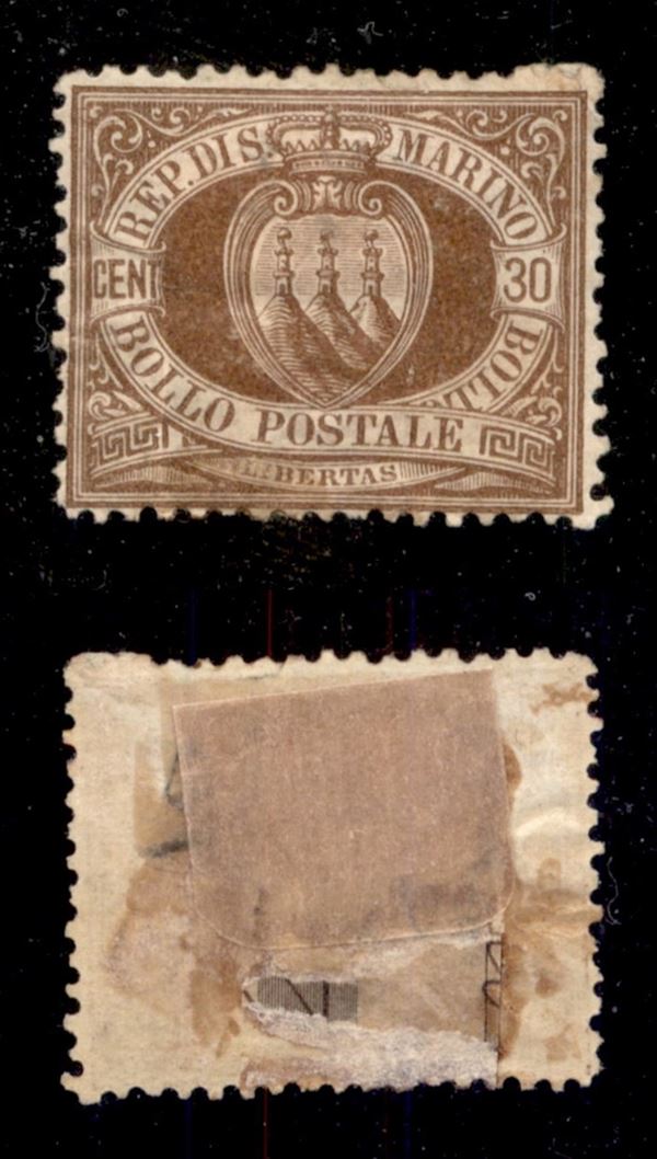 1877 - 30 cent (6) - al retro traccia di forte supporto cartaceo - gomma originale - ben centrato (1.200)