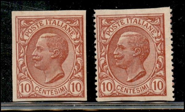 1906 - 10 cent Leoni non dentellato (82e) + non dentellato in orizzontale (82g) - entrambi nuovi con gomma originale e traccia di linguella (110)