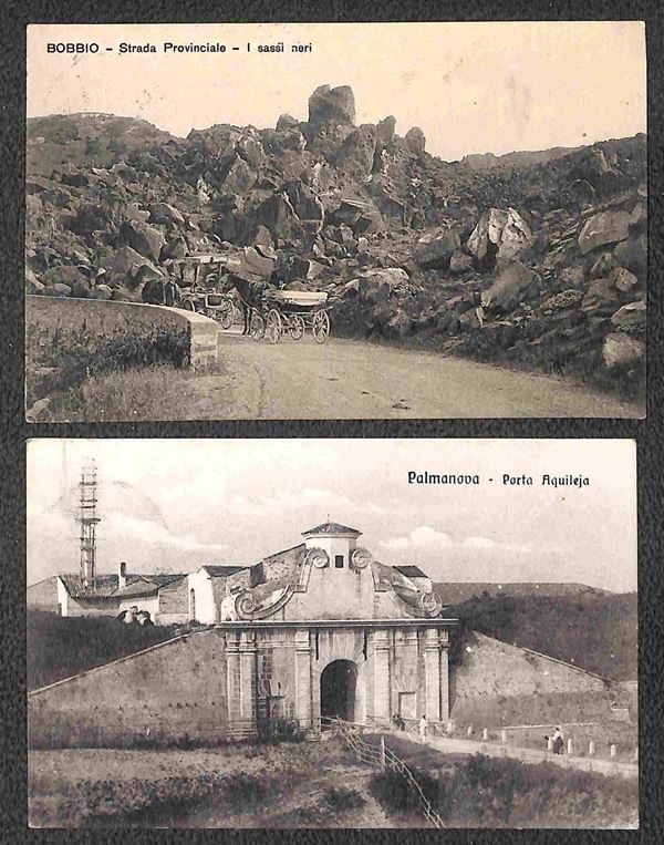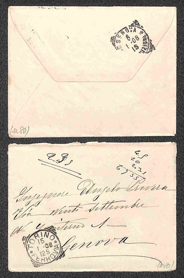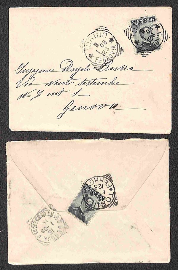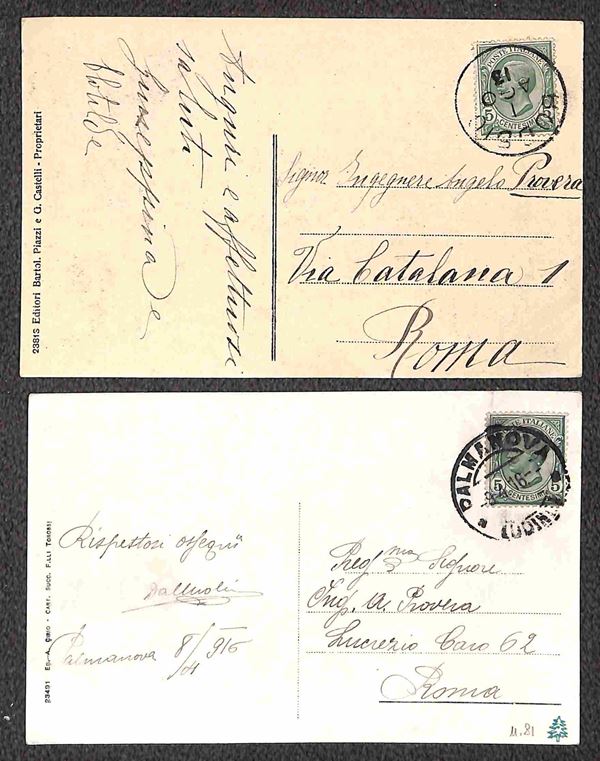 1908/1916 - Insieme di 2 cartoline + 2 buste con affrancatura singola del 5 cent Leoni e del 15 cent Michetti (80 + 81) - ex coll. Provera