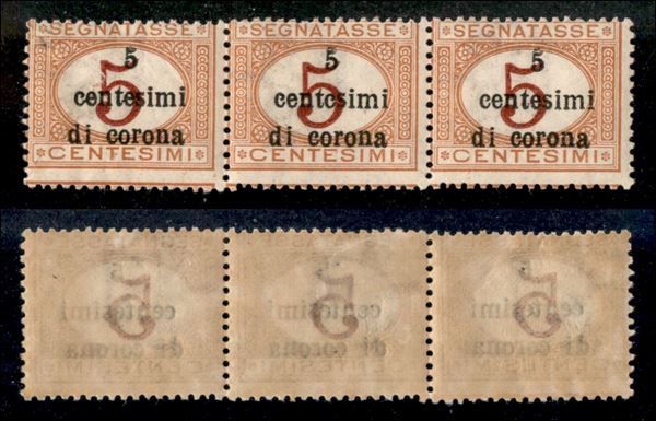 1919 - 5 cent su 5 Segnatasse (1 + 1d + 1) - striscia di 3 - errore tcs al centro - 2 con gomma integra + errore con gomma originale (200+)