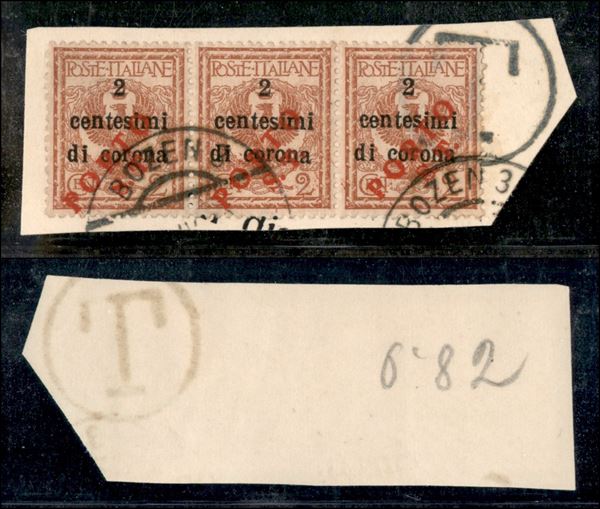 1919 - Porto S.T. su 2 cent su 2 Floreale Segnatasse (134) - striscia di 3 usata su frammento (75+)