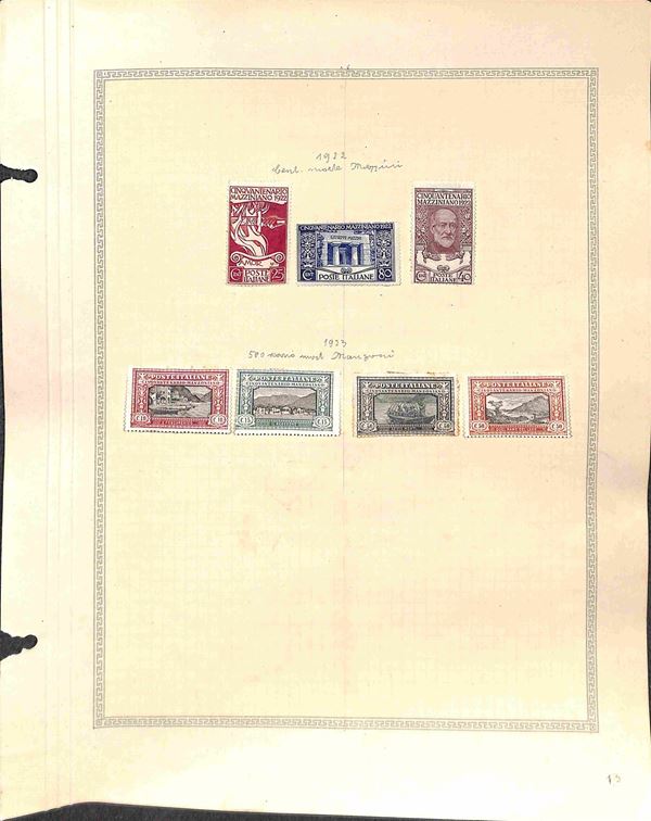 1922/1923 - Mazzini (128/130 - 3 valori con gomma originale) + Manzoni (151/154 - 4 valori nuovi senza gomma) - applicati con linguella su foglio d'album