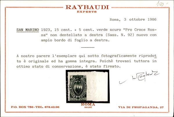 1923 - 15 cent Croce Rossa (92a) bordo foglio non dentellato a destra - gomma integra - cert. Raybaudi (1.500)