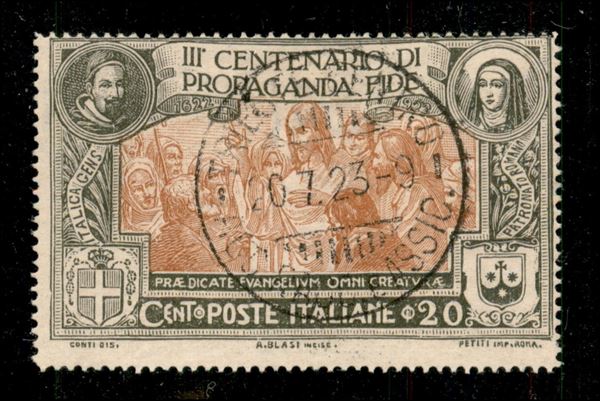 1924 - 20 cent Propaganda Fide (131) usato - filigrana corona solo in alto - non catalogato