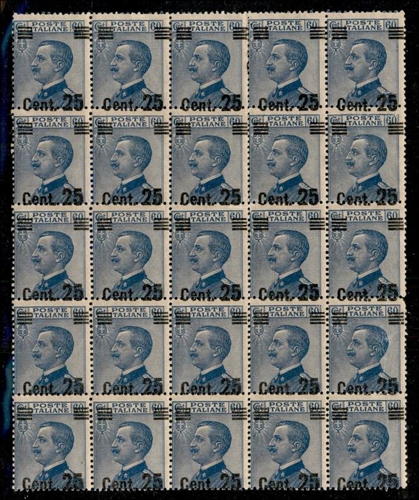 1924 - 25 cent su 60 Michetti (178 varietà b) - soprastampa obliqua - blocco di 25 - gomma integra - non catalogato