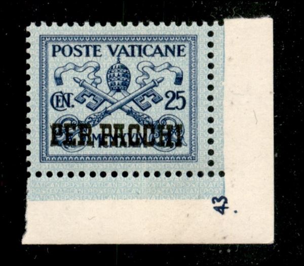 1931 - 25 cent Pacchi Postali (4) angolo di foglio con numero di Tavola - gomma integra