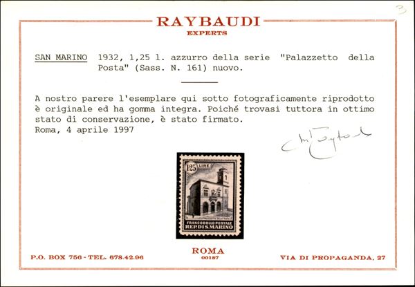 1932 - 1,25 lire Palazzetto (161) - gomma integra - cert. Raybaudi (800)