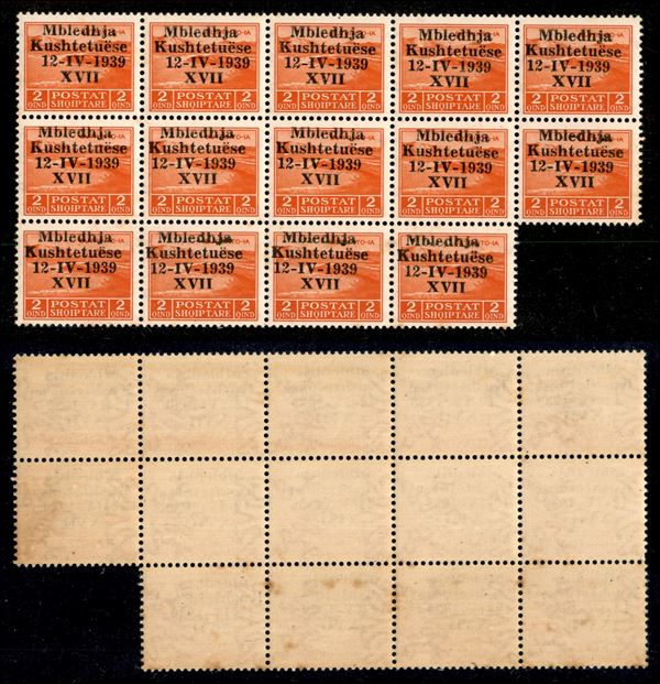 1939 - 2 qind (2) - blocco di 14 - soprastampe disallineate in verticale - gomma integra - qualche punto giallo in basso