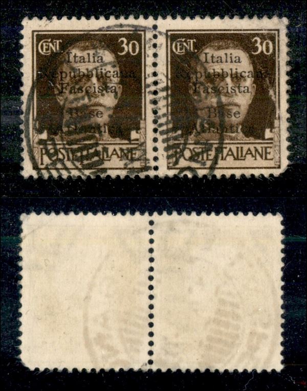 1943 - 30 cent (10) coppia difettosa in angolo basso a destra - pezzo di sinistra con L diverso (10 g) + I di Italia capovolto - non catalogato - usato