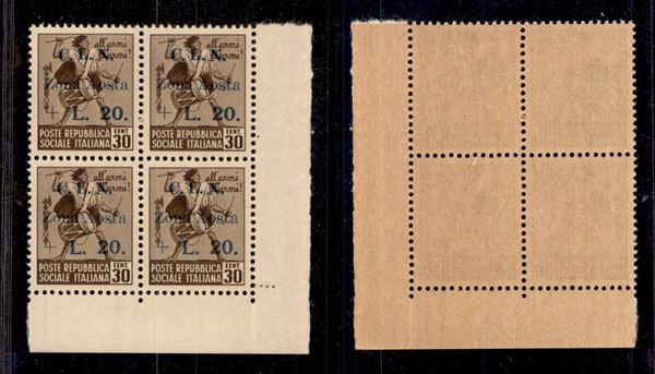 1944 - 30 cent + 20 lire (7) - quartina angolare con soprastampa ripetuta a secco sul margine destro - gomma integra (630+)