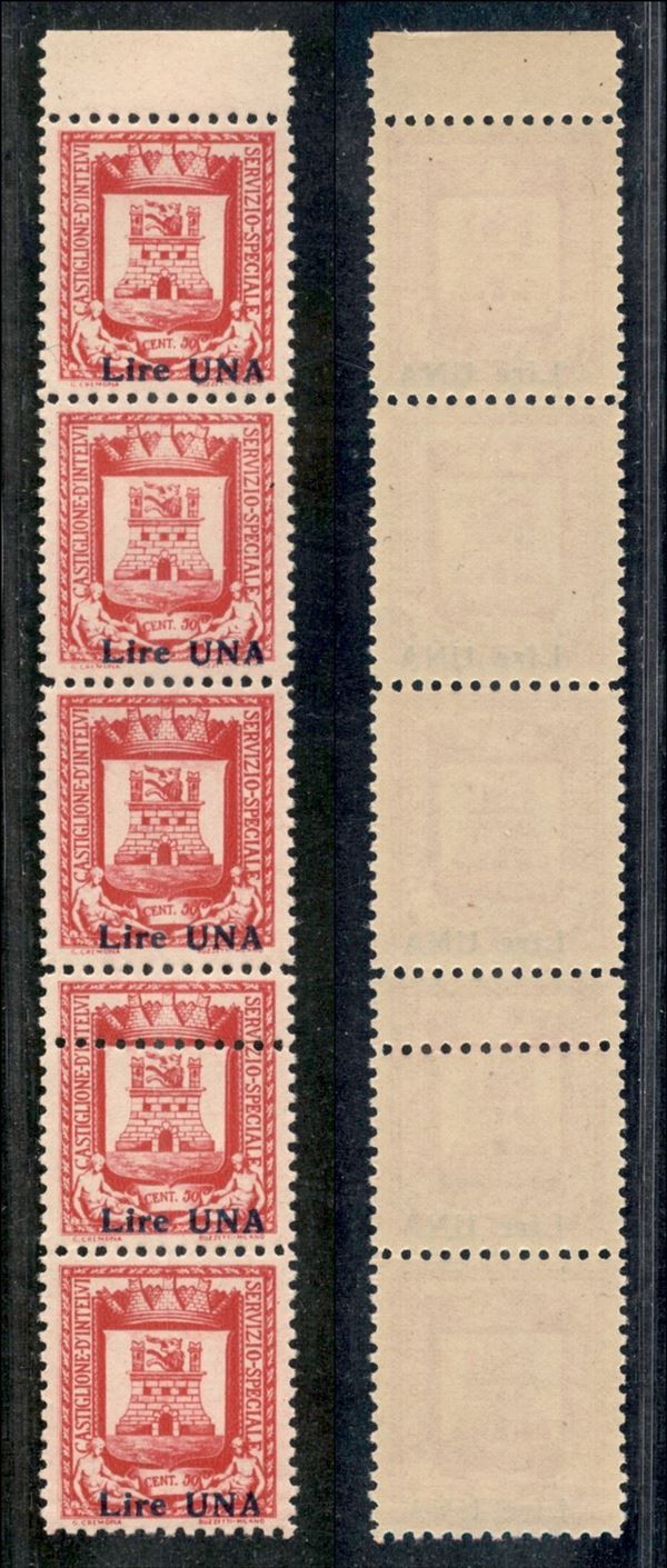 1945 - 1 lira su 50 cent (19cb) con doppia dentellatura - striscia con 4 normali - gomma integra (340)