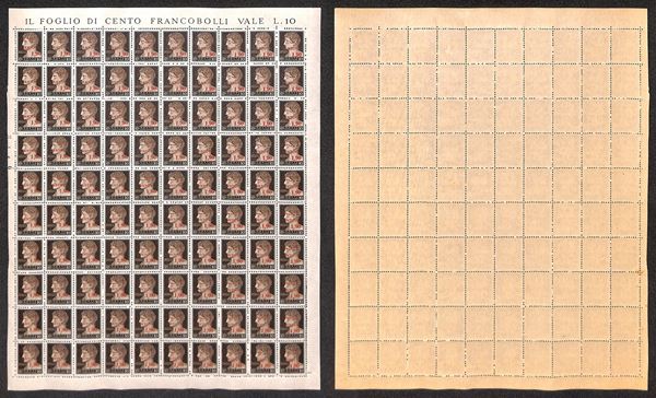 1945 - 10 cent + 1,90 lire (1) - foglio di 100 - gomma integra con gli errori di composizione + 1 rotto (pos. 52) + 1 deformato con virgola scalpellata (pos. 77) non catalogati