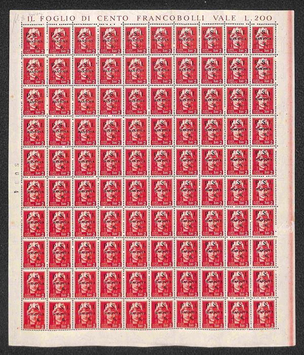 1945 - 2 lire + 6 (8 varietà) con soprastampe oblique - intero foglio di 100 con tutti gli errori e le varietà della composizione e filigrana capovolta - gomma integra - non catalogato